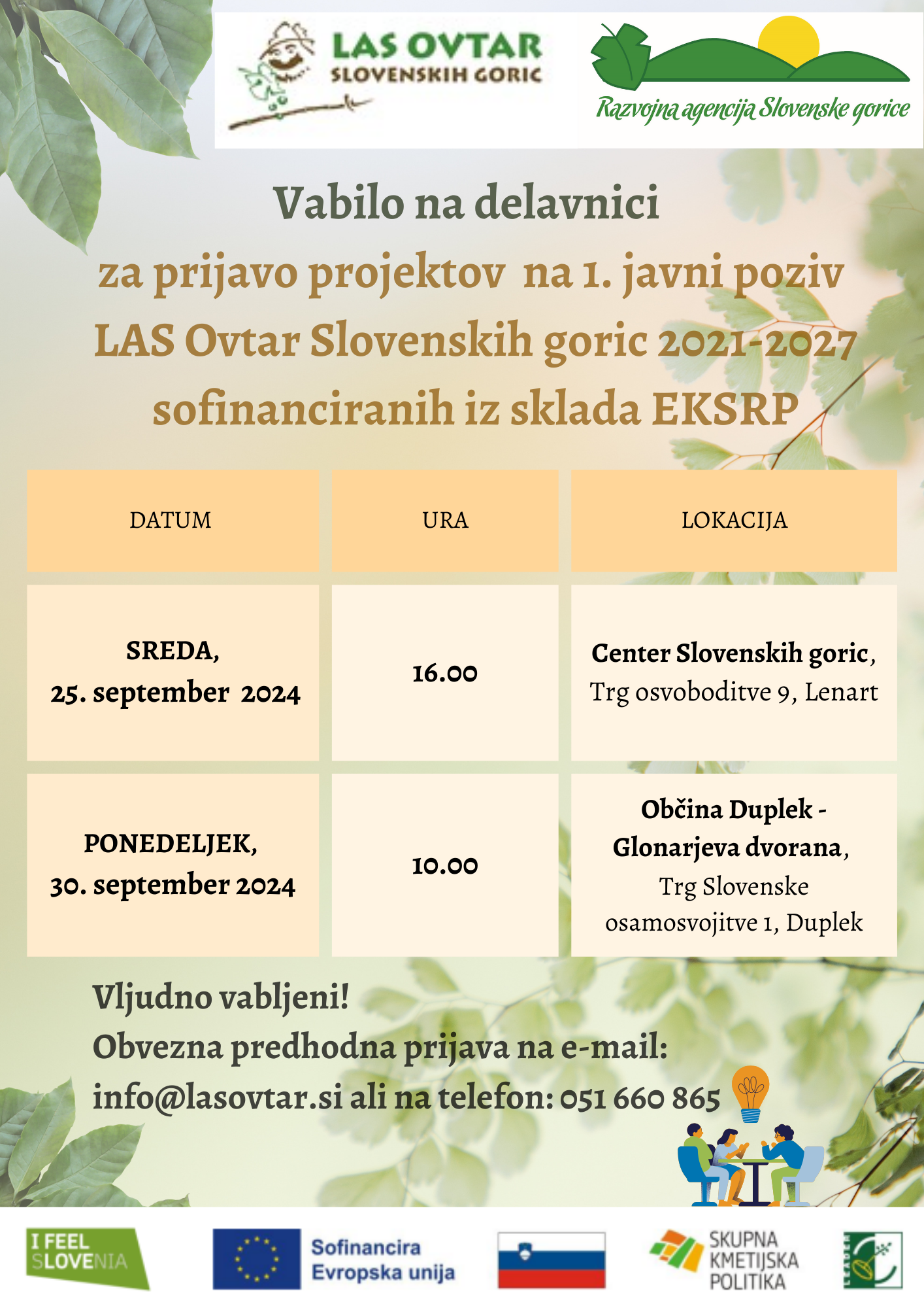 Obveščamo vas, da od petka 15. 11. 2024 dalje deluje na novo postavljena spletna aplikacija za vnos in oddajo projektnih vlog na 1. javni poziv za izbor projektov za uresničevanje ukrepov Strategije lokalnega razvoja na območju LAS Ovtar Slovenskih goric, sofinanciranih iz Evropskega kmetijskega sklada za razvoj podeželja (EKSRP).